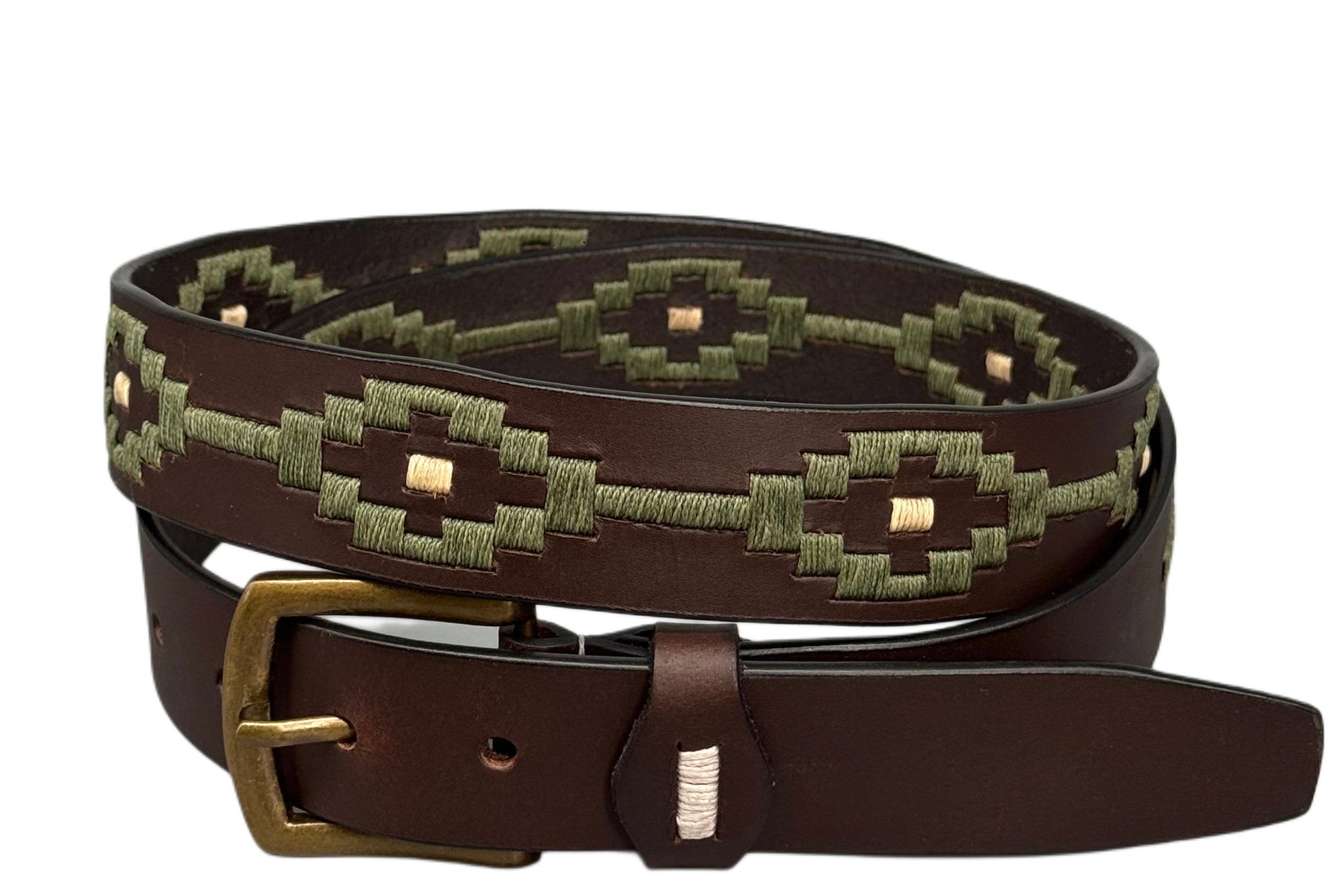 Cinturón artesanal, con inspiración étnica. Su cierre es una hebilla de piel auténtica, y en el interior lleva un logotipo grabado que refleja su calidad.