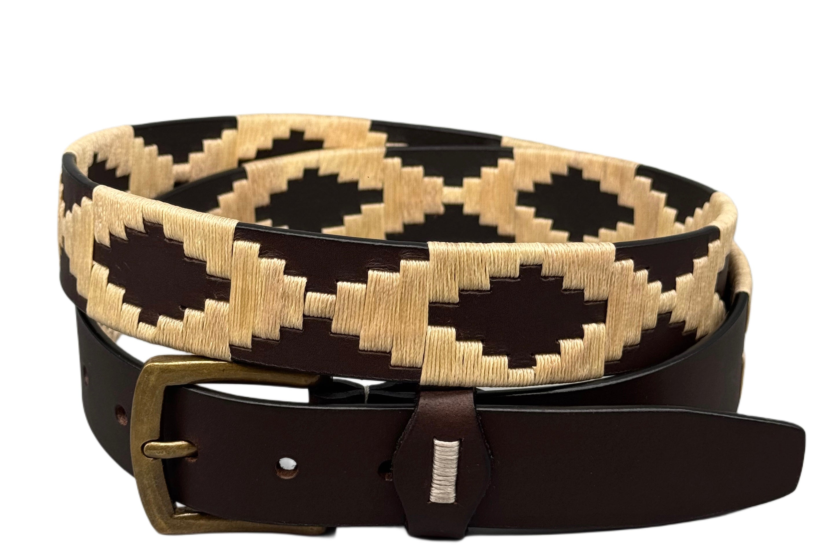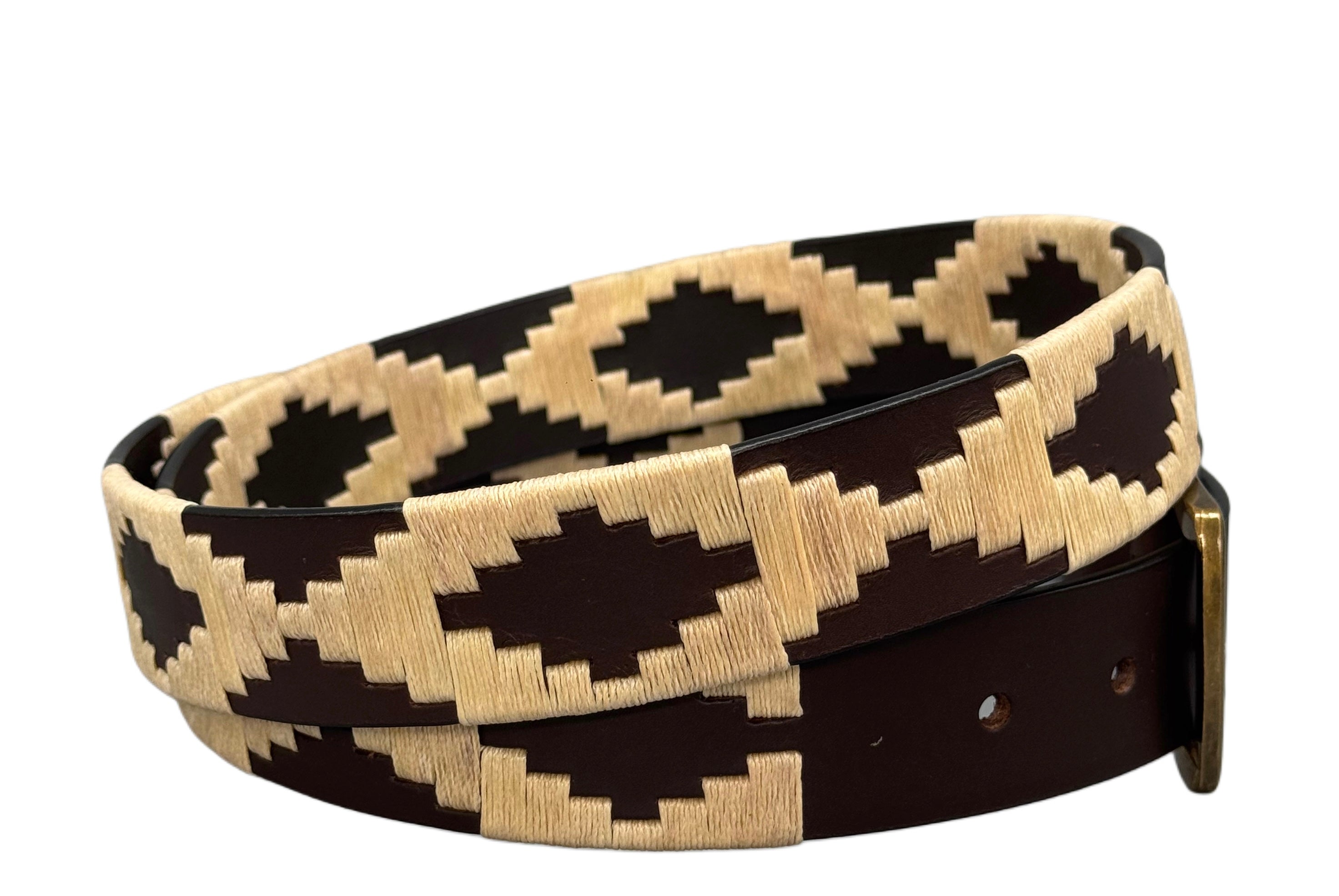 Cinturón artesanal, con inspiración étnica. Su cierre es una hebilla de piel auténtica, y en el interior lleva un logotipo grabado que refleja su calidad.