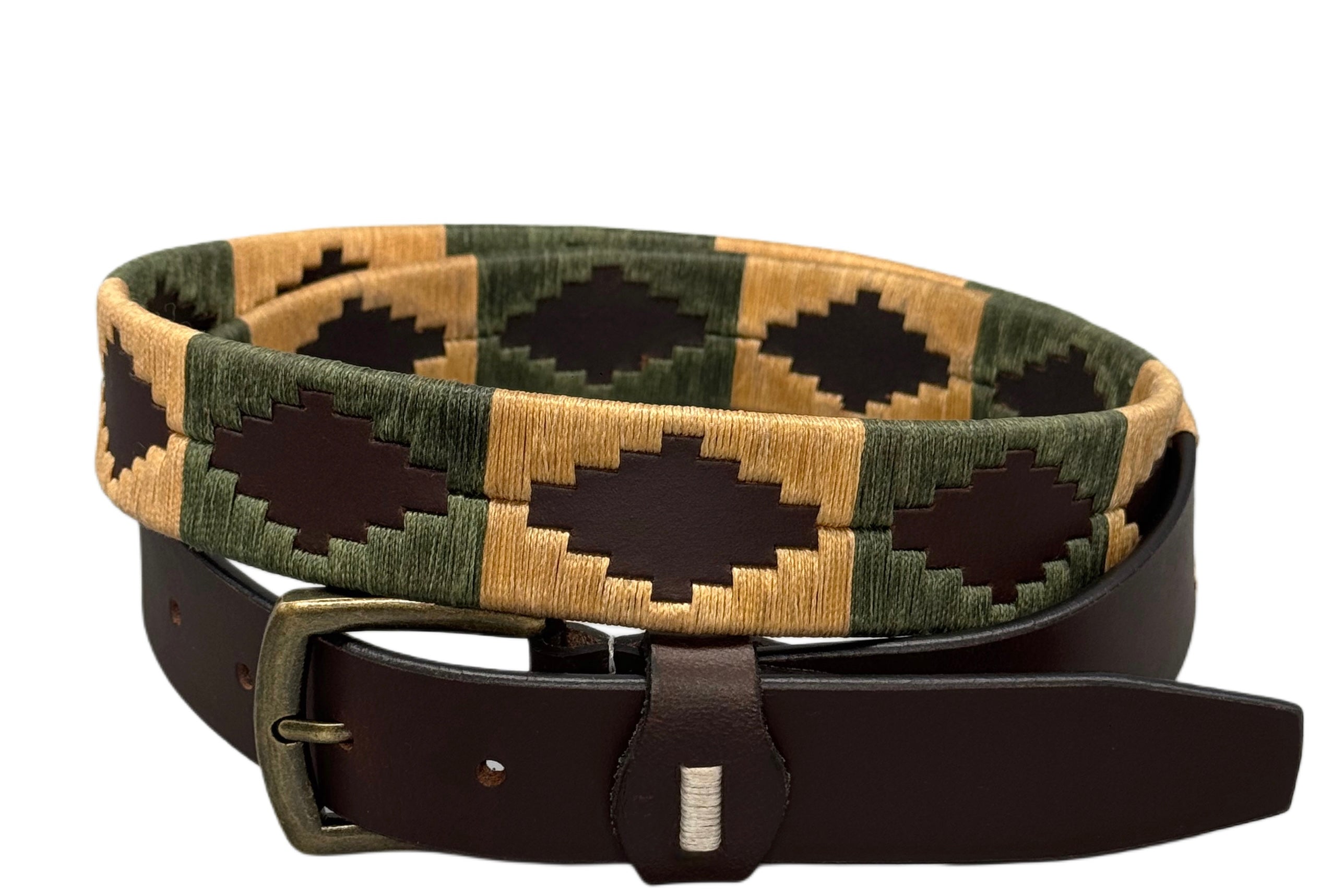 Cinturón artesanal, con inspiración étnica. Su cierre es una hebilla de piel auténtica, y en el interior lleva un logotipo grabado que refleja su calidad.