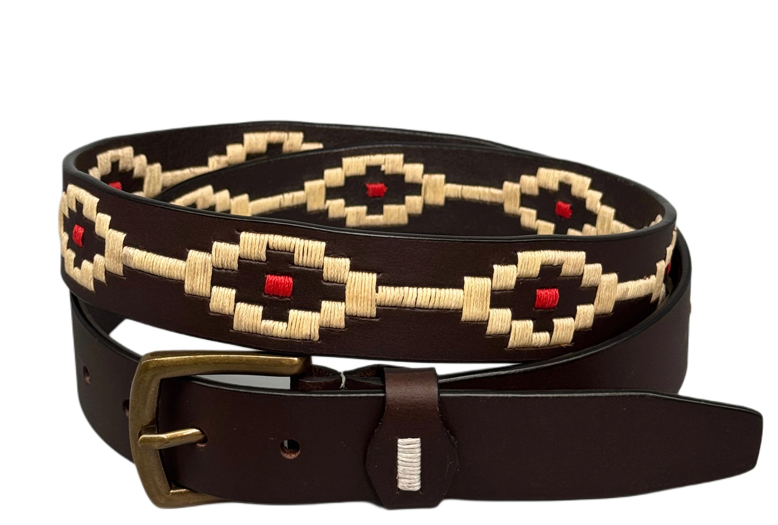 Cinturón artesanal, con inspiración étnica. Su cierre es una hebilla de piel auténtica, y en el interior lleva un logotipo grabado que refleja su calidad.