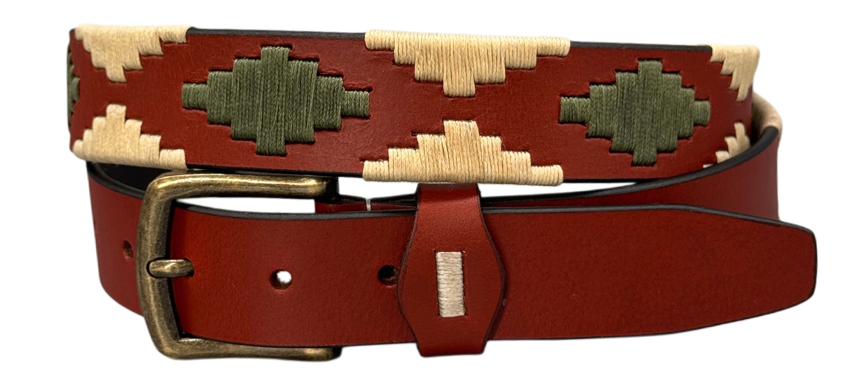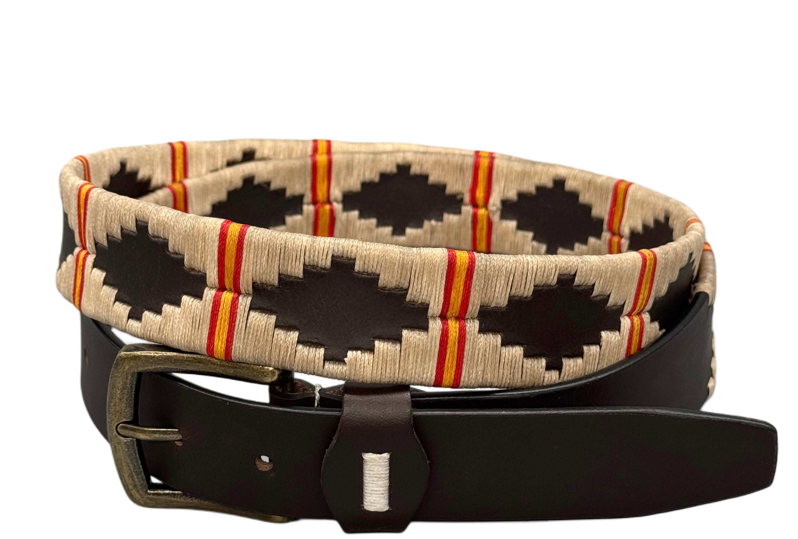 Cinturón artesanal, con inspiración étnica. Su cierre es una hebilla de piel auténtica, y en el interior lleva un logotipo grabado que refleja su calidad.